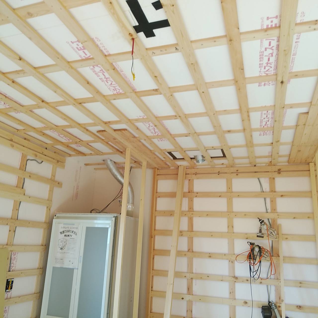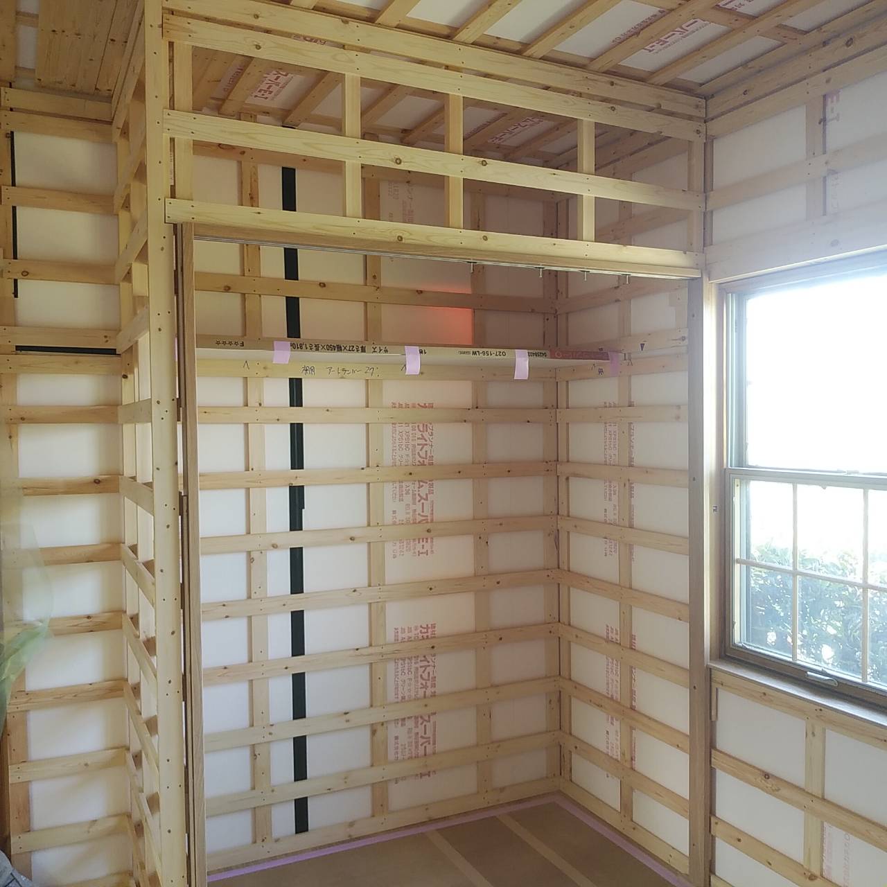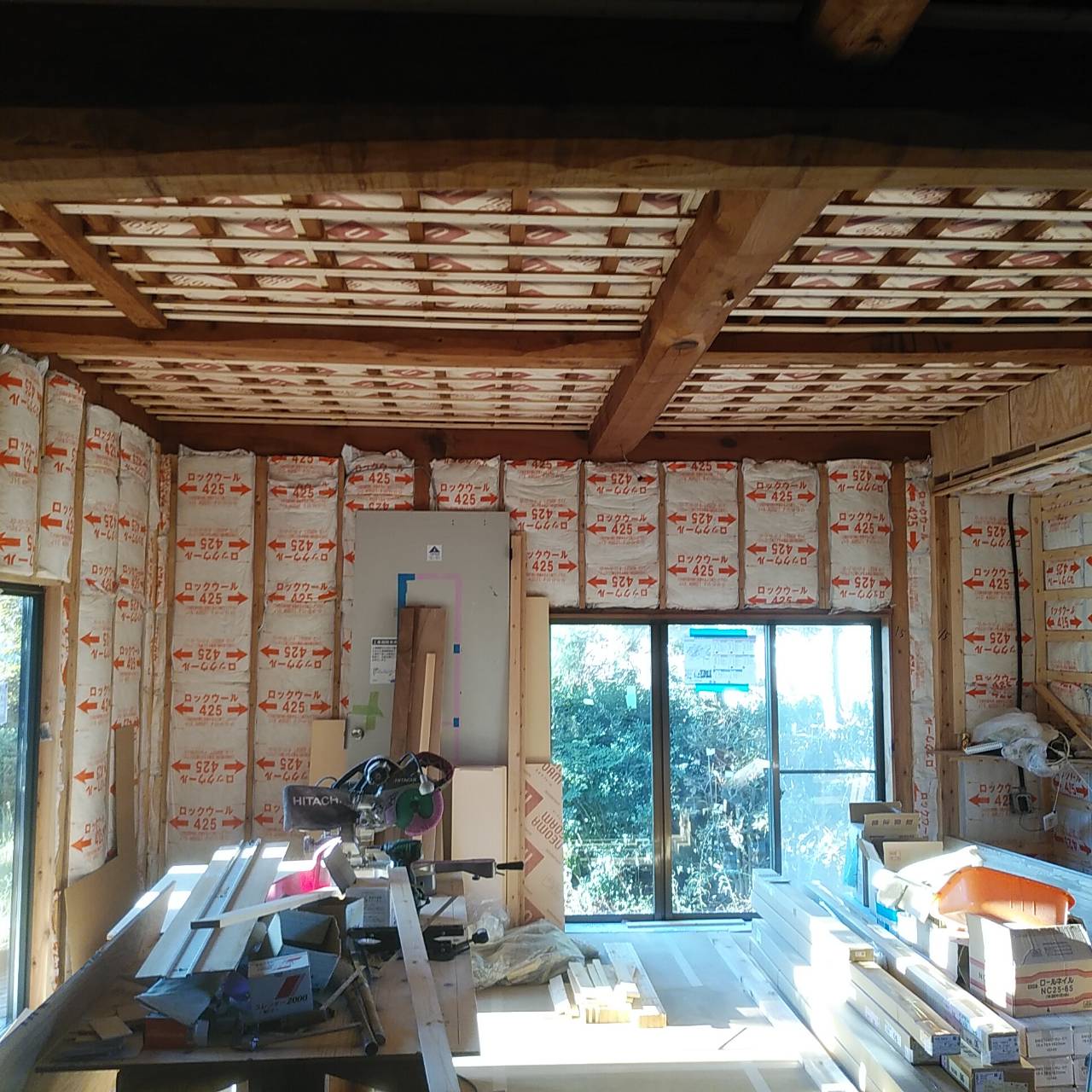 離れのお部屋も着々と工事が進んでいます。 断熱材が天井・壁に取り付けられています。