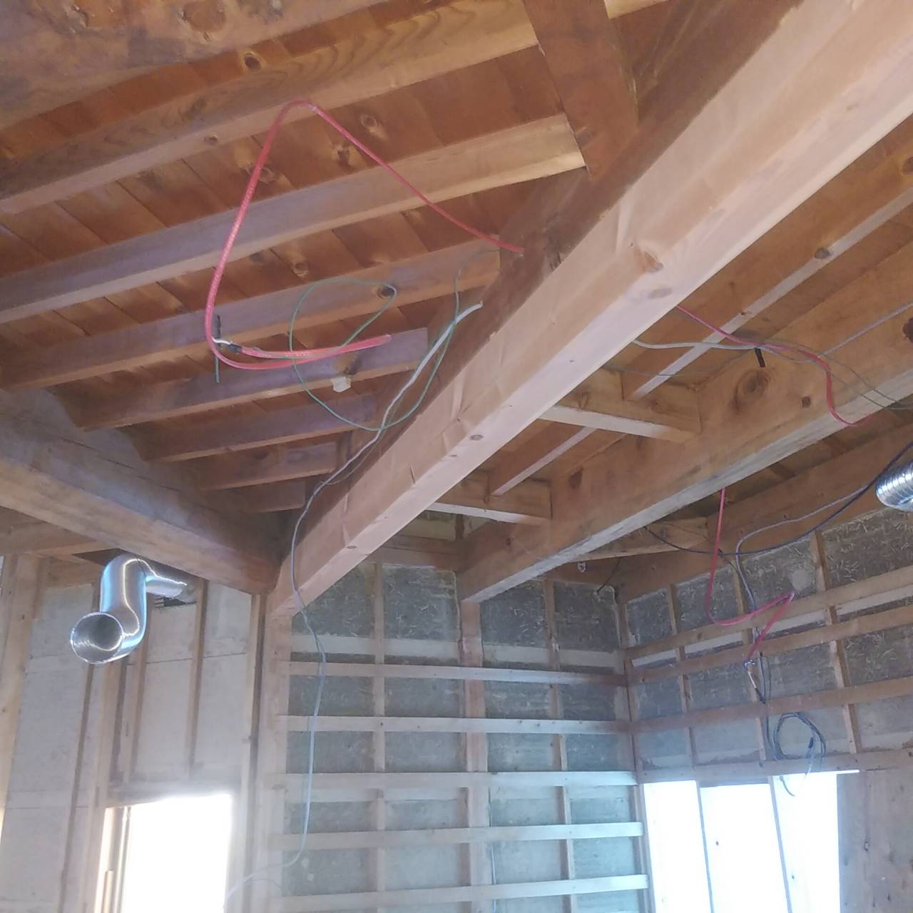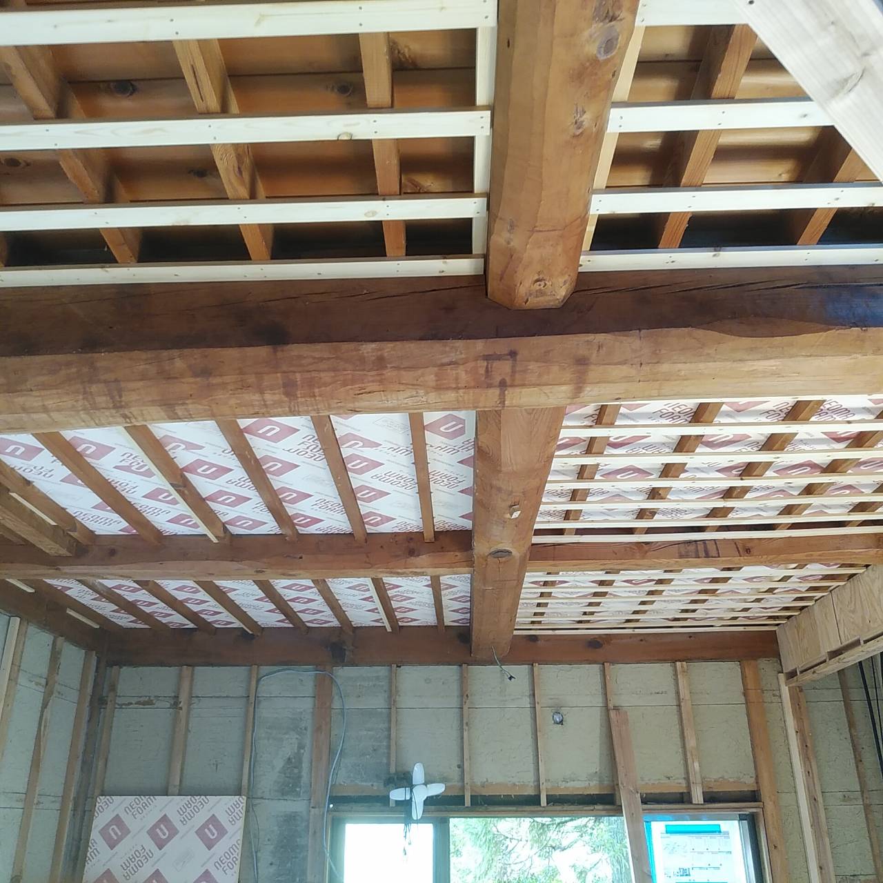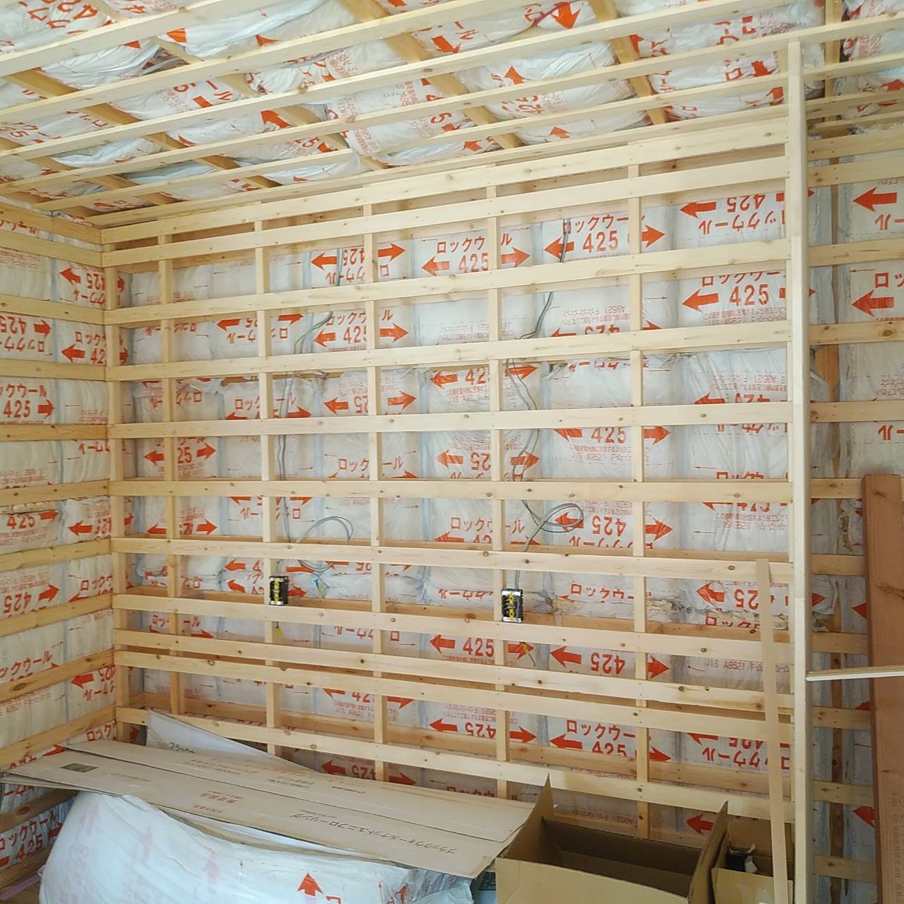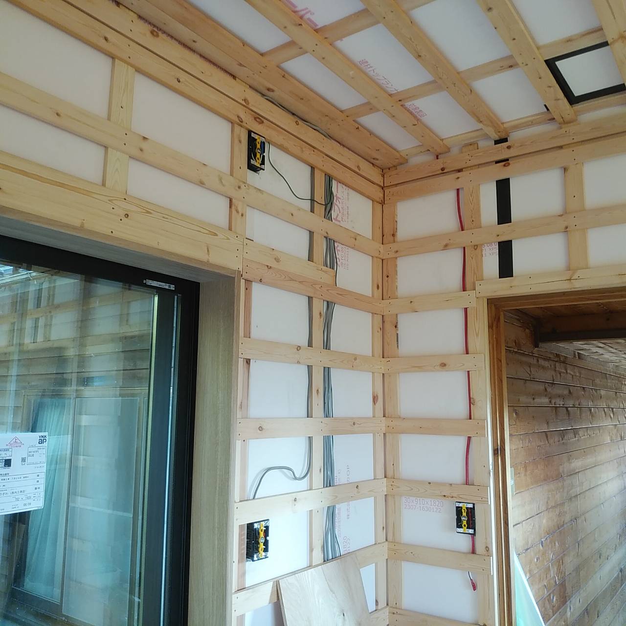 離れのお部屋も着々と工事が進んでいます。 断熱材が天井・壁に取り付けられています。