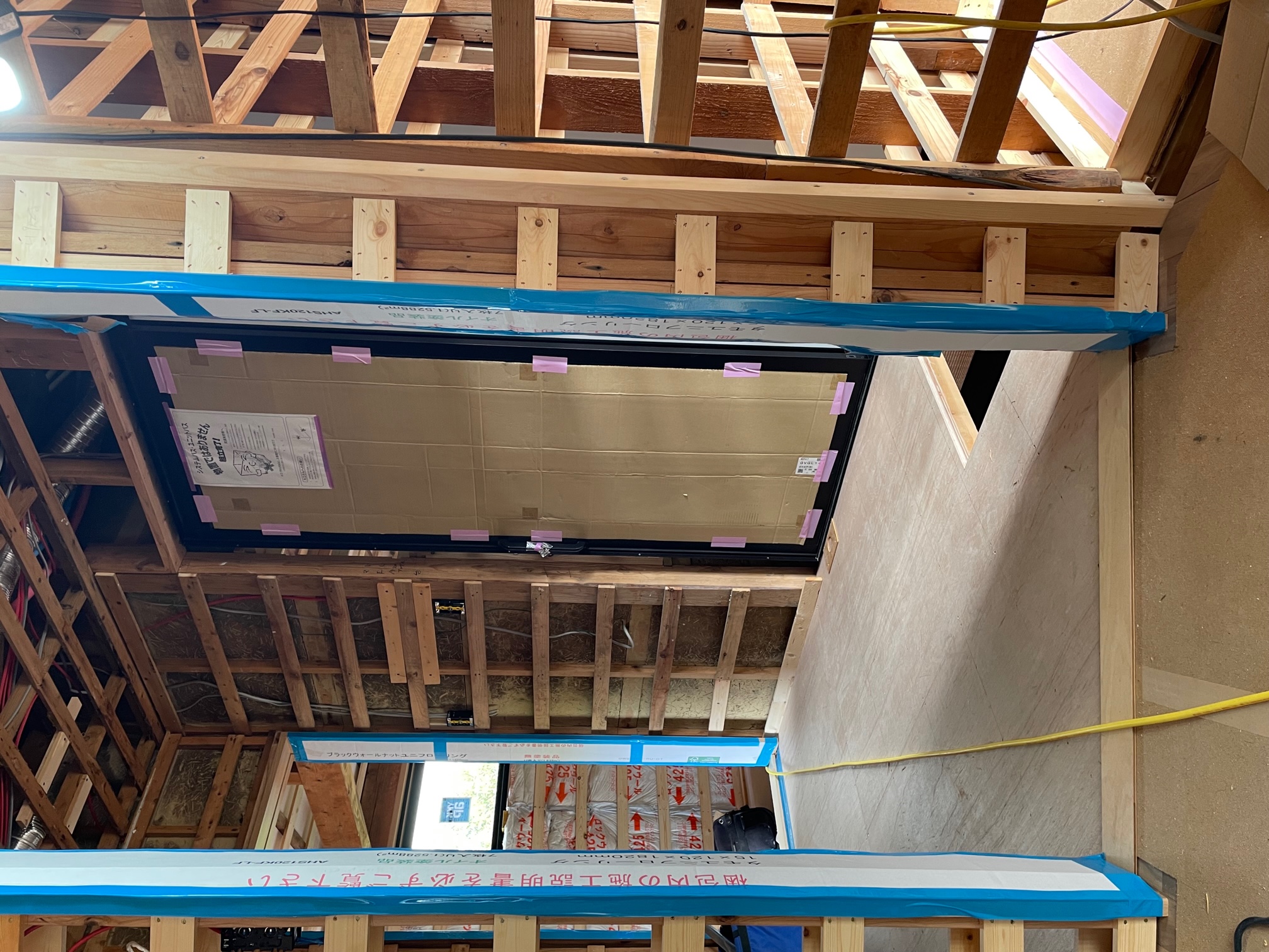 ウッドデッキ東面の大きなサッシの取付けが完了しています。 朝日が差し込み気持ちのよいLDKになります。