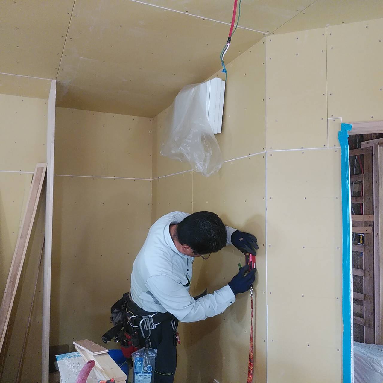 LDK天井部分の断熱材の施工が行われています。脚立を使いながらの作業となるため根気のいるお仕事になります。