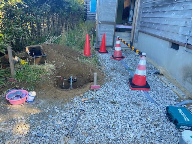 離れのお部屋に新たな水廻りを設けるため、排水管の取り付けを行っています。