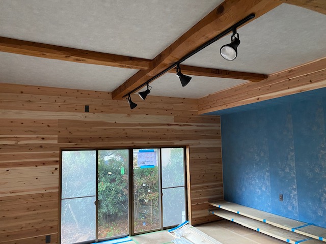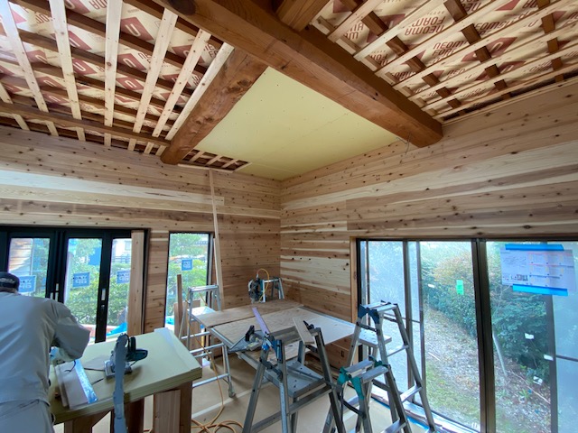 壁の板貼りが終わり、天井のボード貼りに着手しています。