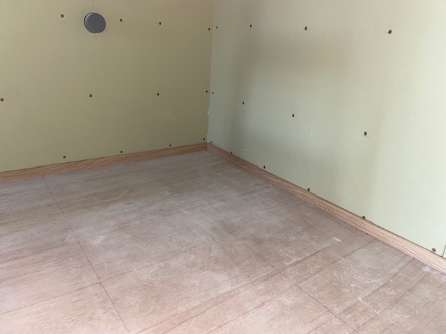 洋室シャワールームを設置するスペースです。ユニットがきれいに収まるように床の高さを調整しています。