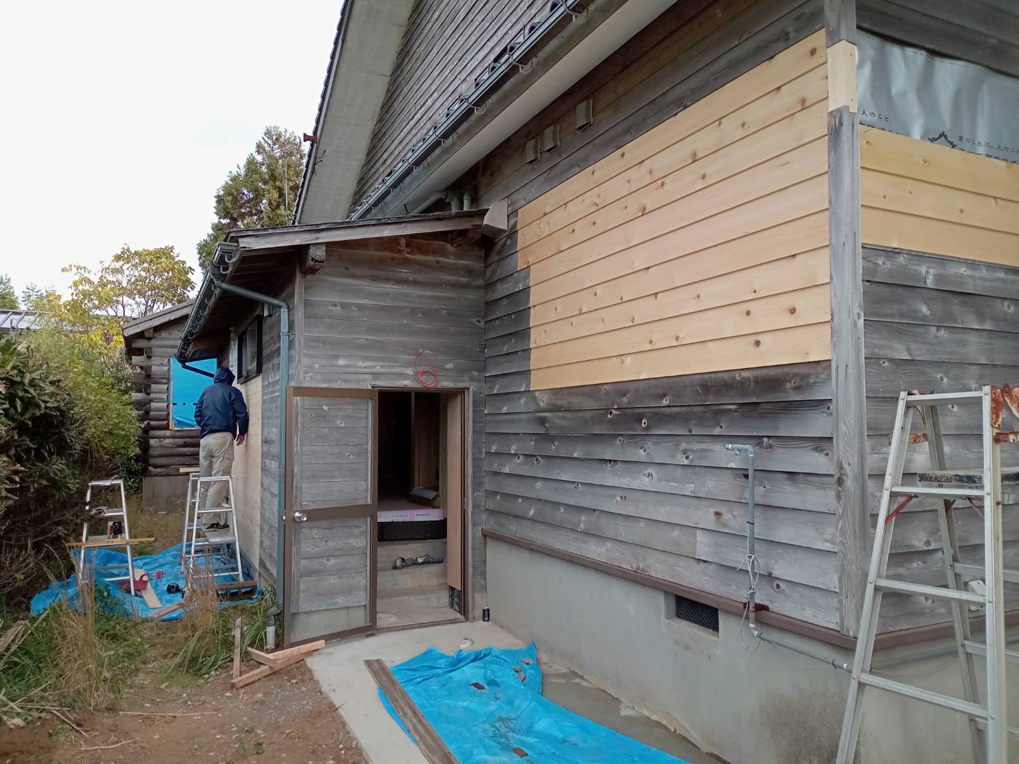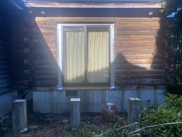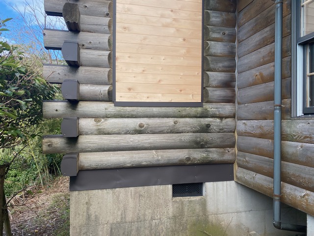ログハウス部分の雨風でいたんでいた部分も板金で補修いたしました。