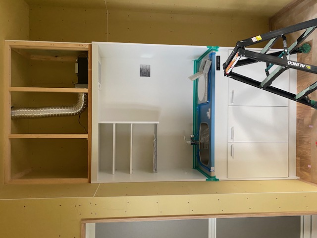 ユニットバスの取り付けが完了しています。 家の中心にドンと構えています。