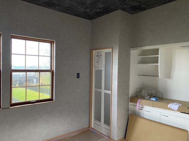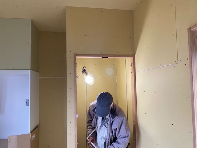 大工さんの工事が終わり、今週よりクロス工事が始まりました。 月曜日に行ったパテが乾いたことから、本日よりクロス貼りが始まります。