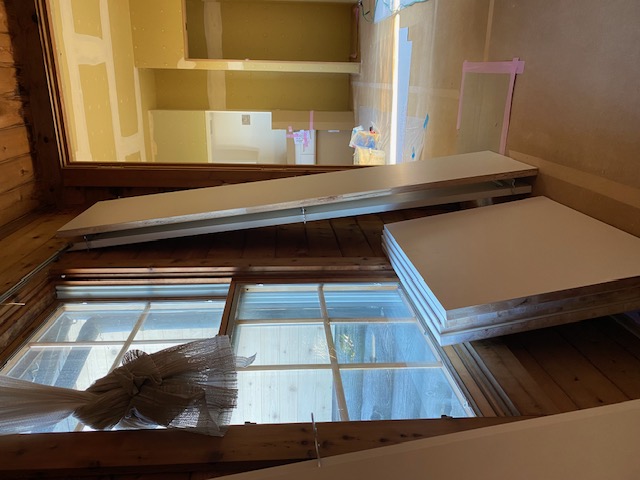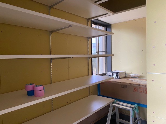 収納内部に取り付ける加工済みの棚板です。クロス工事が完了しましたらお取り付けします。