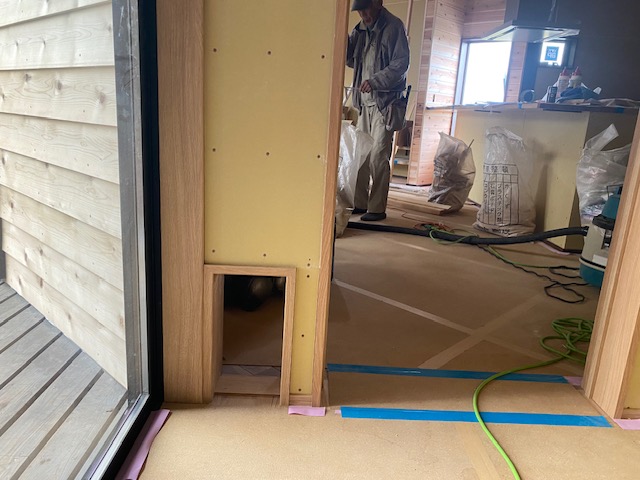 大工さんが細部の見切り材取付けの仕事をなされていました。 完成時の見栄えに関わる大切な仕事のため、丁寧な作業をなされていました。