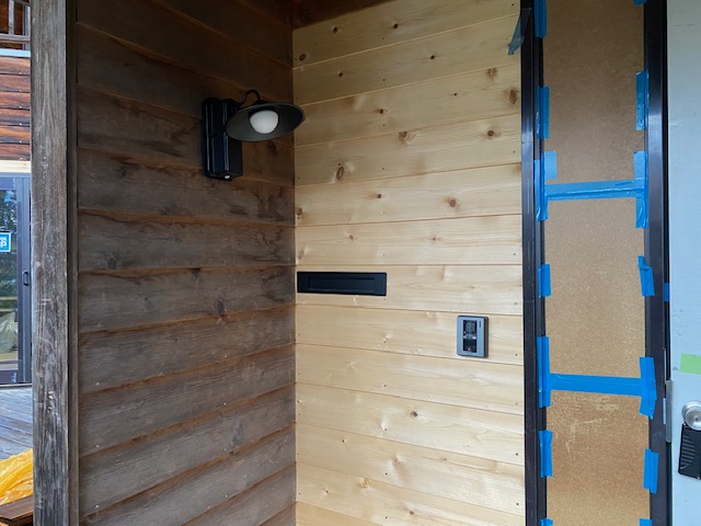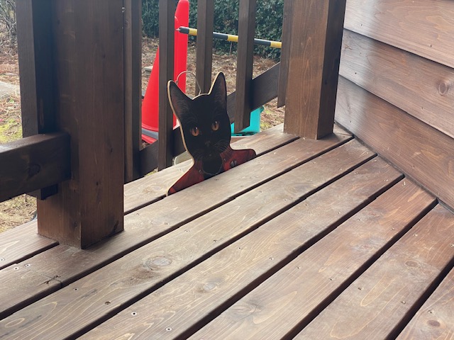 本日安全パトロールを行いました。 外部の工事もほぼ完了いたしましたので、仮設トイレ、廃棄物缶の撤収を行っていきます。 画像は正面ウッドデッキの出入り口部分にある「びっくり猫ちゃん」です これがあると愛猫のごまちゃん、まめちゃんが、怖がって外に出ないとことです。