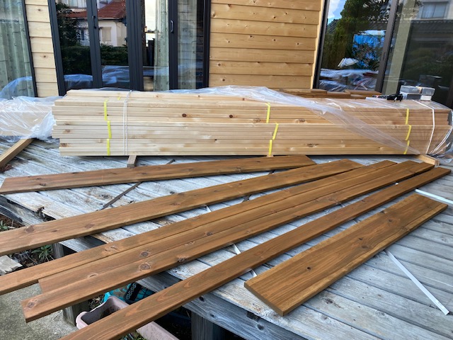 年明け以降のウッドデッキ工事に向けて、本日ごまめ様にご挨拶にお伺いしたところ、ごまめ様にて行う塗装が着々と進んでおりました。 プロ顔負けの出来栄えでした。