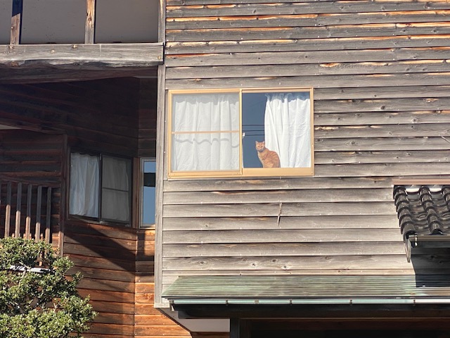ふと二階を見上げると、窓際にねこちゃんがいました! ごまちゃんか、まめちゃんです。朝日の浴びる暖かな場所でまったりとしておられました。