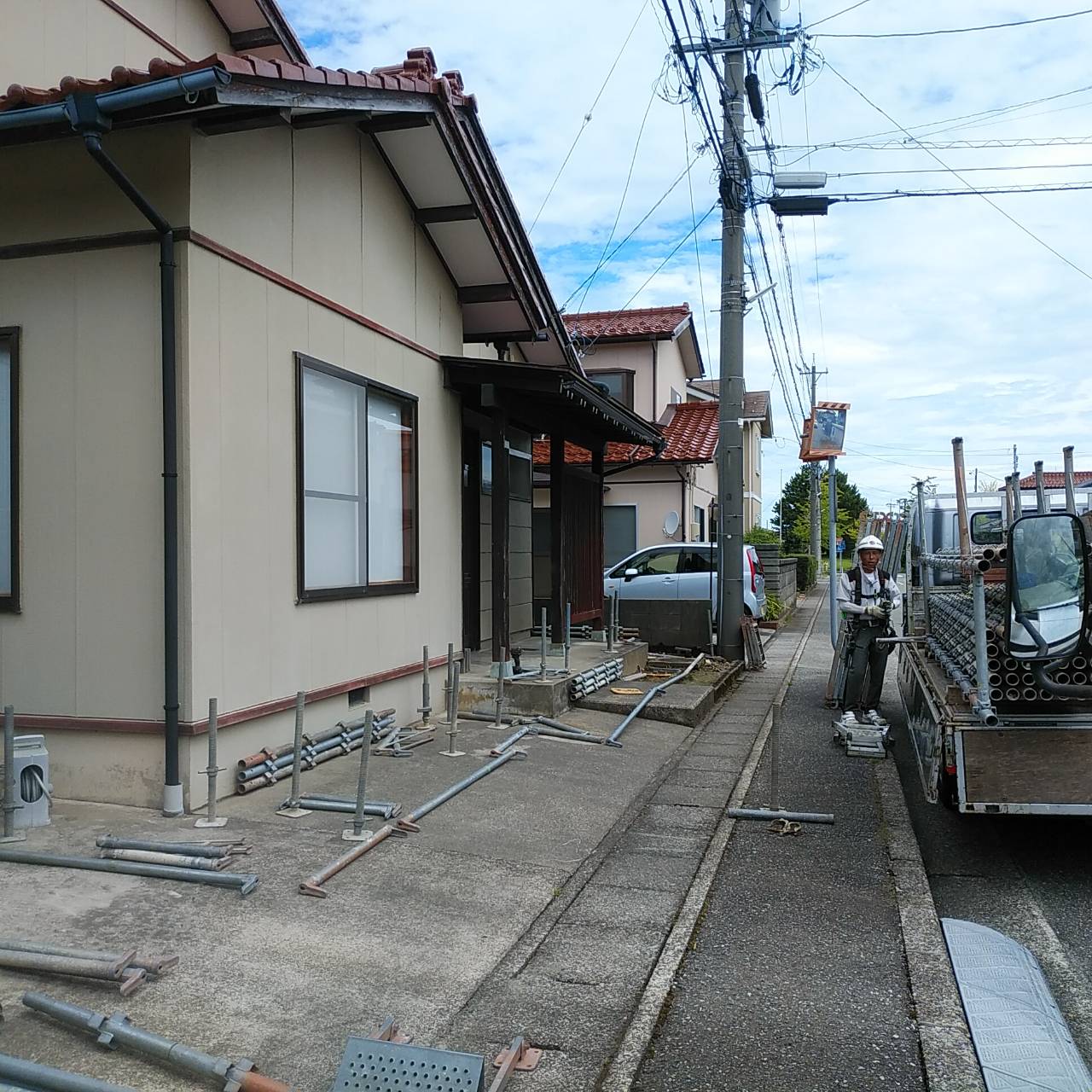 本日はお盆明けの瓦葺き替え工事に向けて外部足場組の作業に着手しております。当たり前のことですが、作業員の方はみなさんこの猛暑の中ヘルメットを着用して作業なされていました。