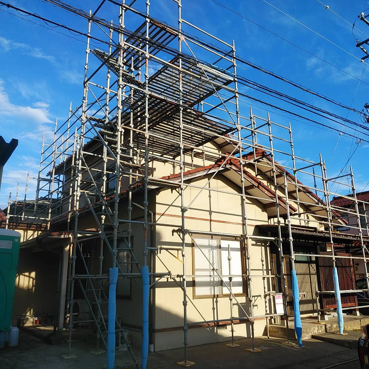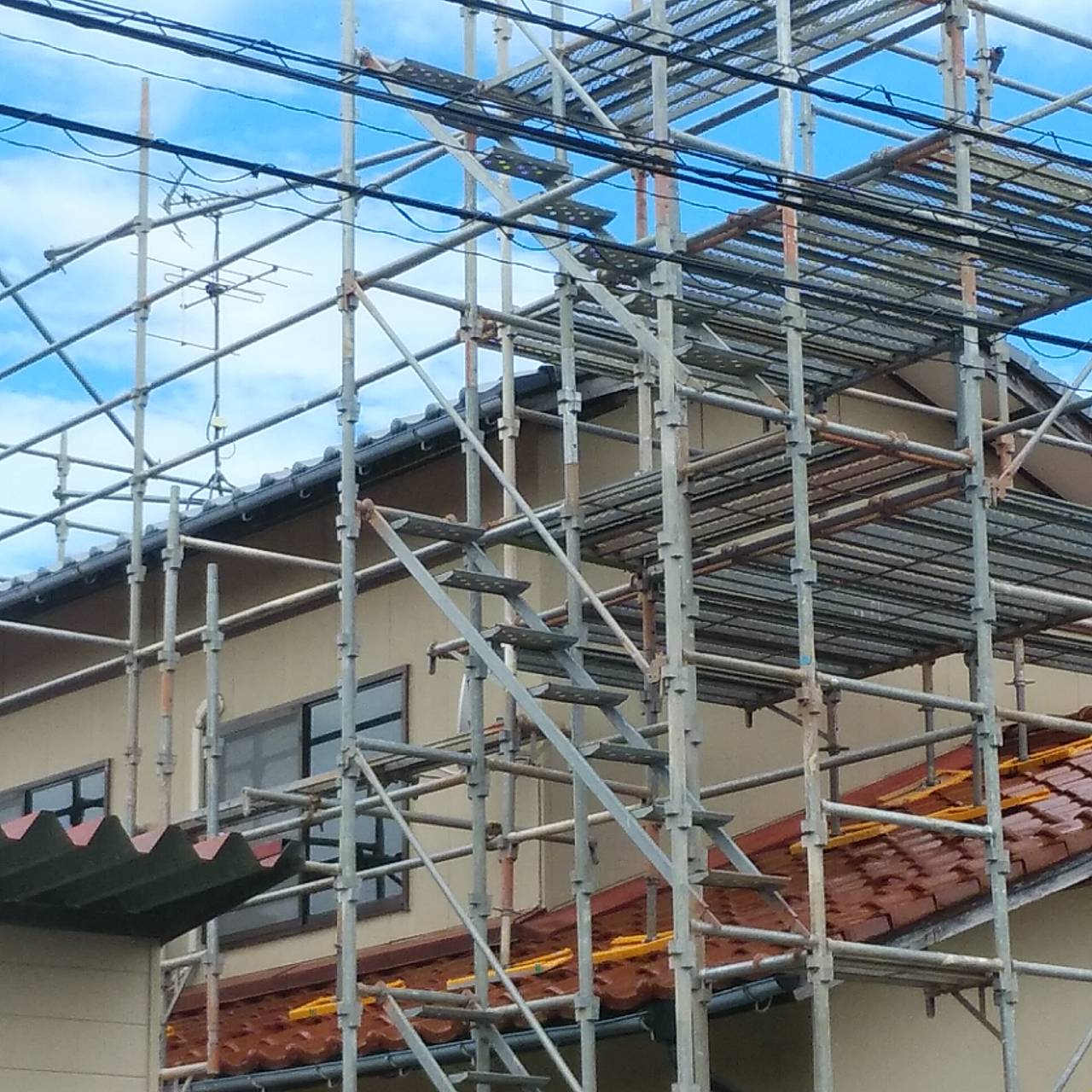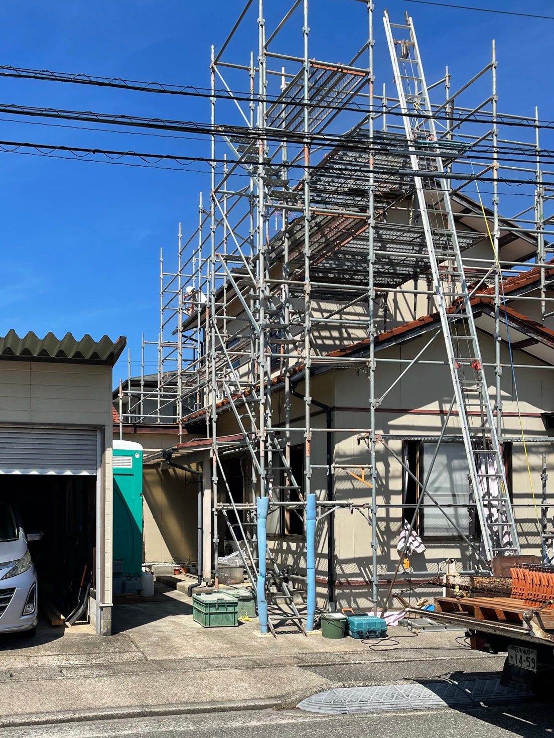 足場組が完了しています。お二階部分には新しい瓦を仮置きするステージが設けられています。