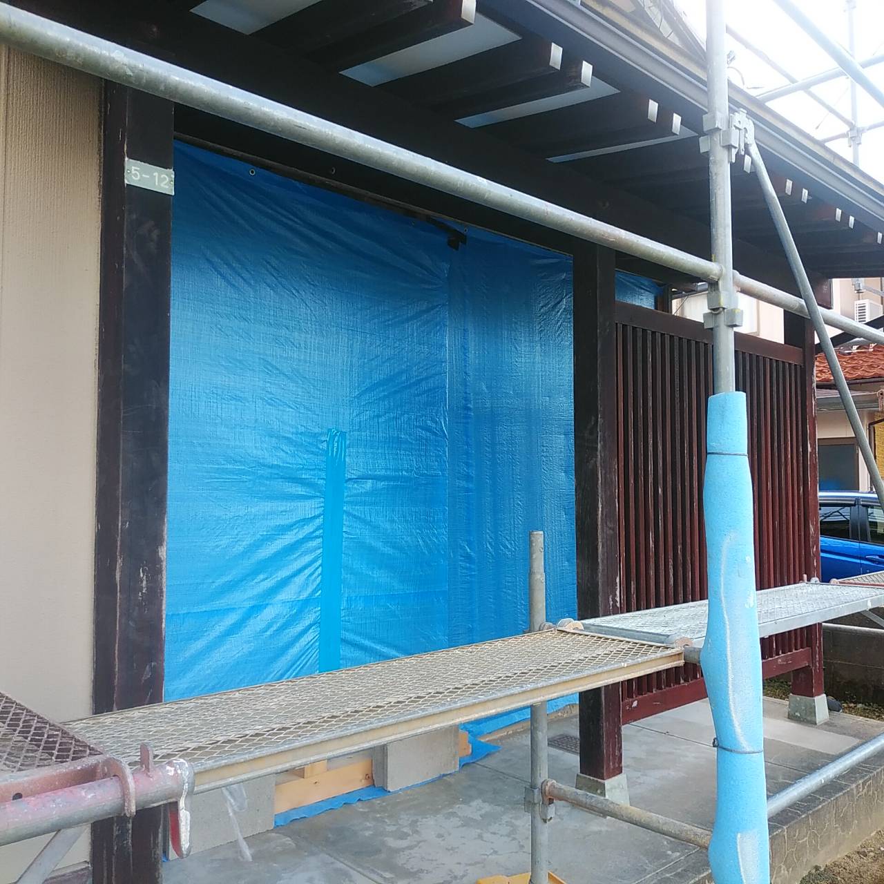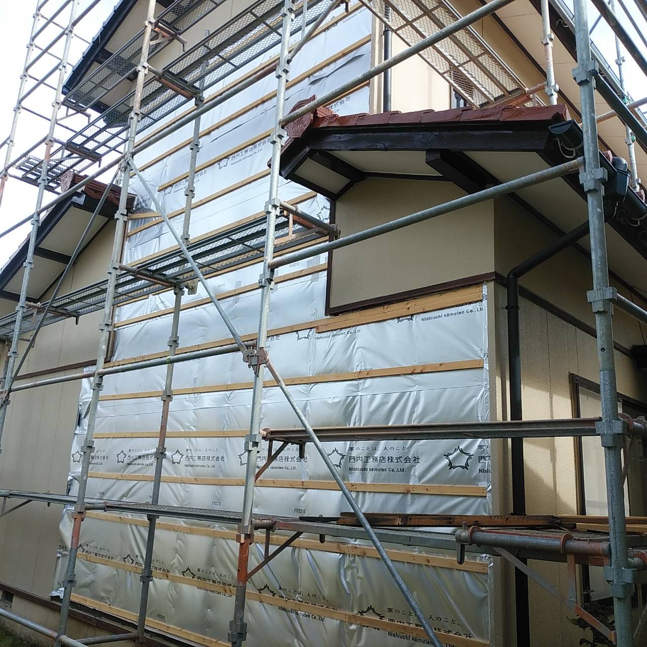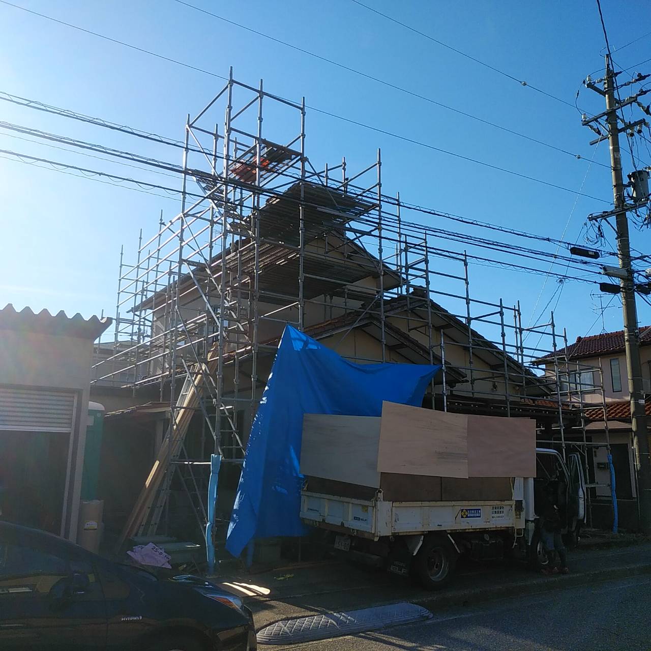 先日の台風に備えて解体した部分の養生を行っておりましたが、台風に限らず不安定な天気に備えて、より強固な養生を行いました。 来週末より瓦工事に着手いたします。