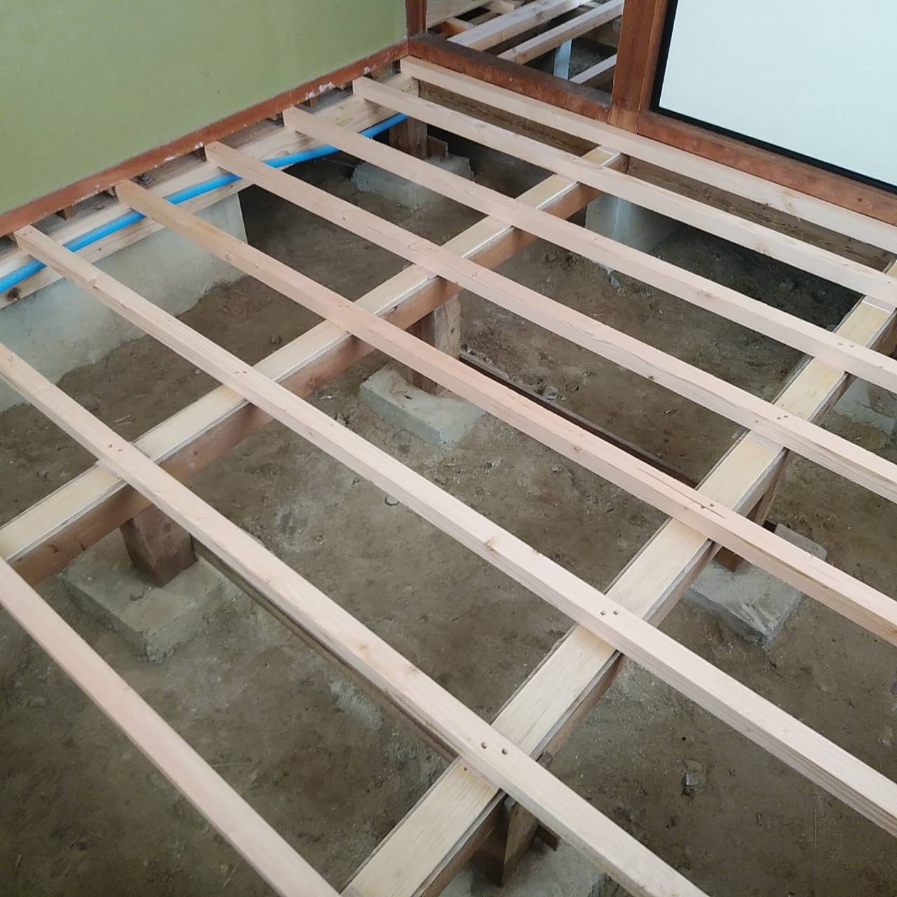 各お部屋の床タルキの取り付けが終わっています。 明日は防蟻剤の塗布を行っていきます。
