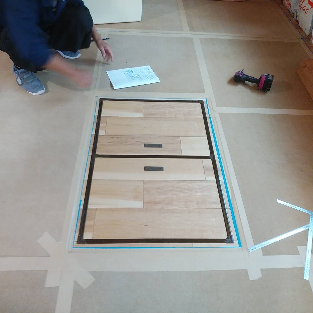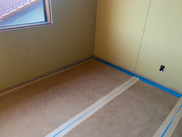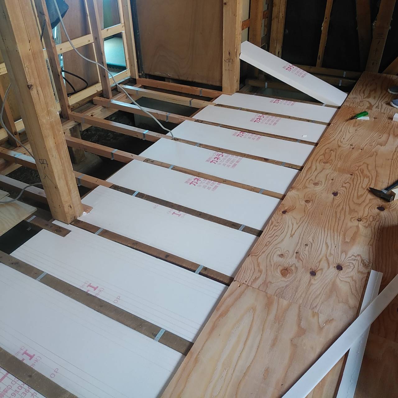 床の断熱材を施工したあとは、写真のように構造用合板という下地材を敷いていきます。