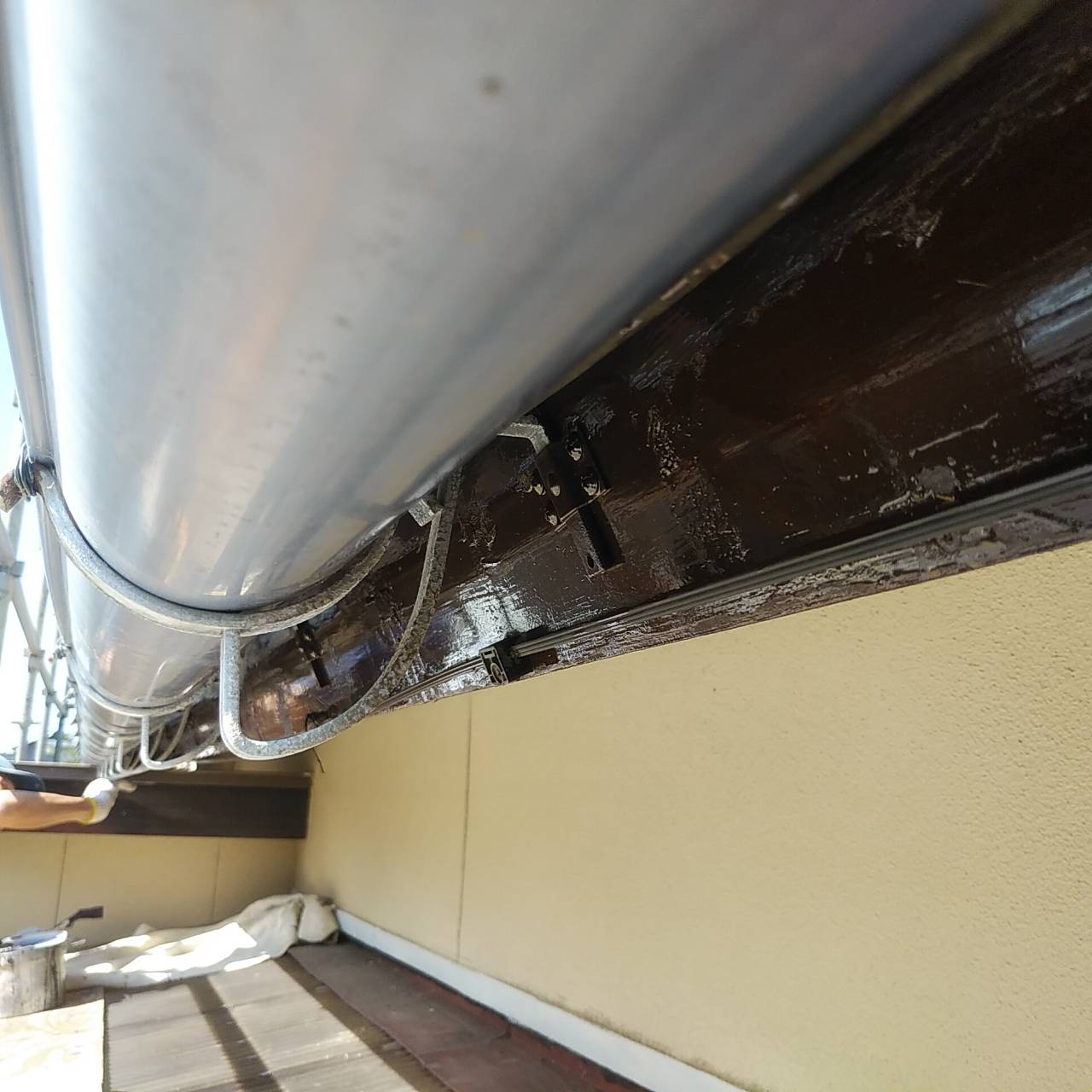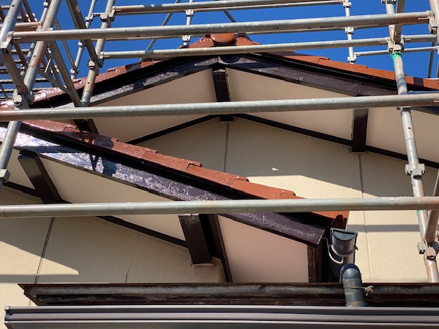 内部で大工さんの工事が進められる中、外部でも着々と工事が進められています。画像は屋根下破風と母屋の塗装を行った様子です。 足場があり多少見にくいですが、きれいな仕上がりになっていました。