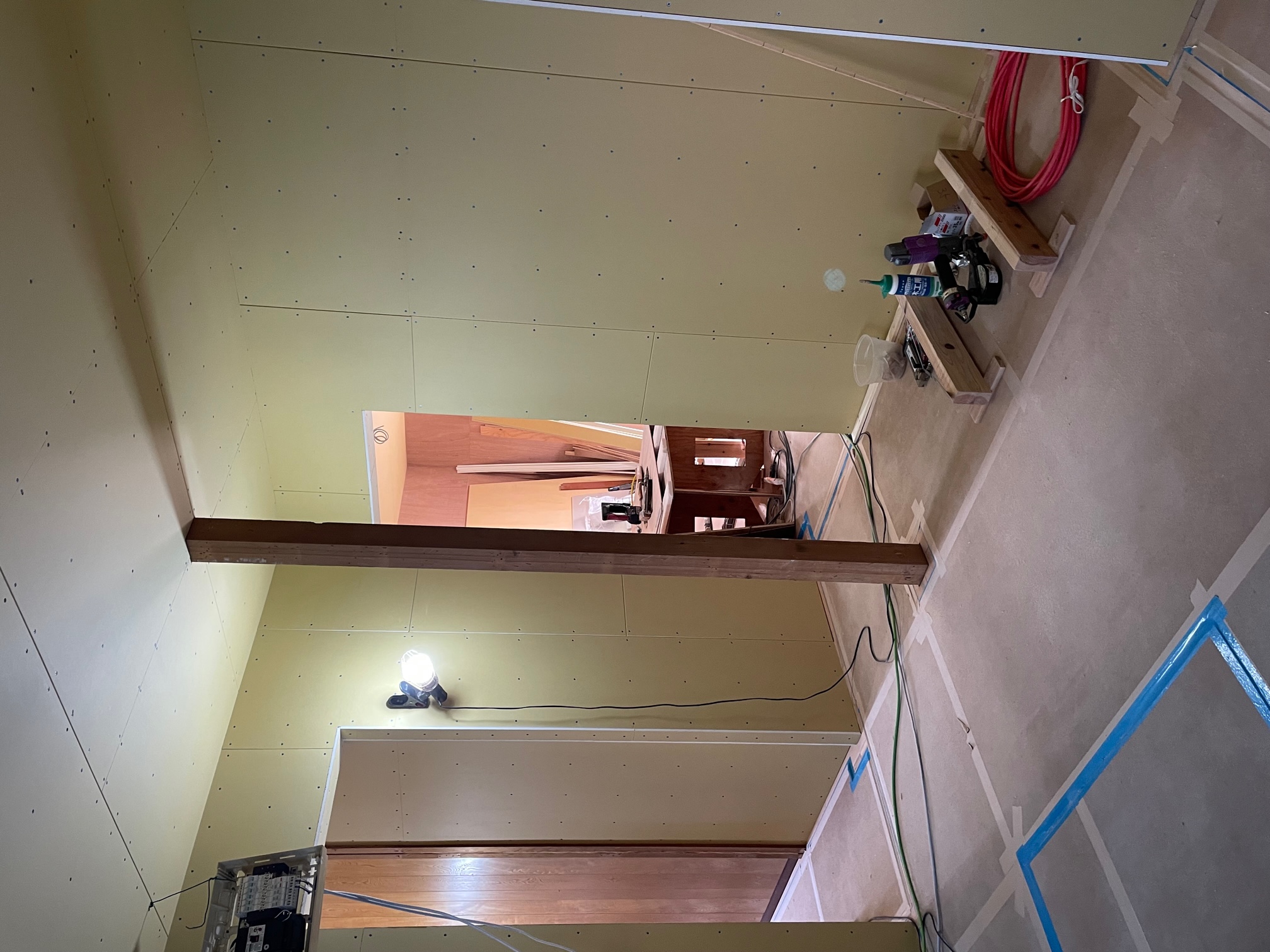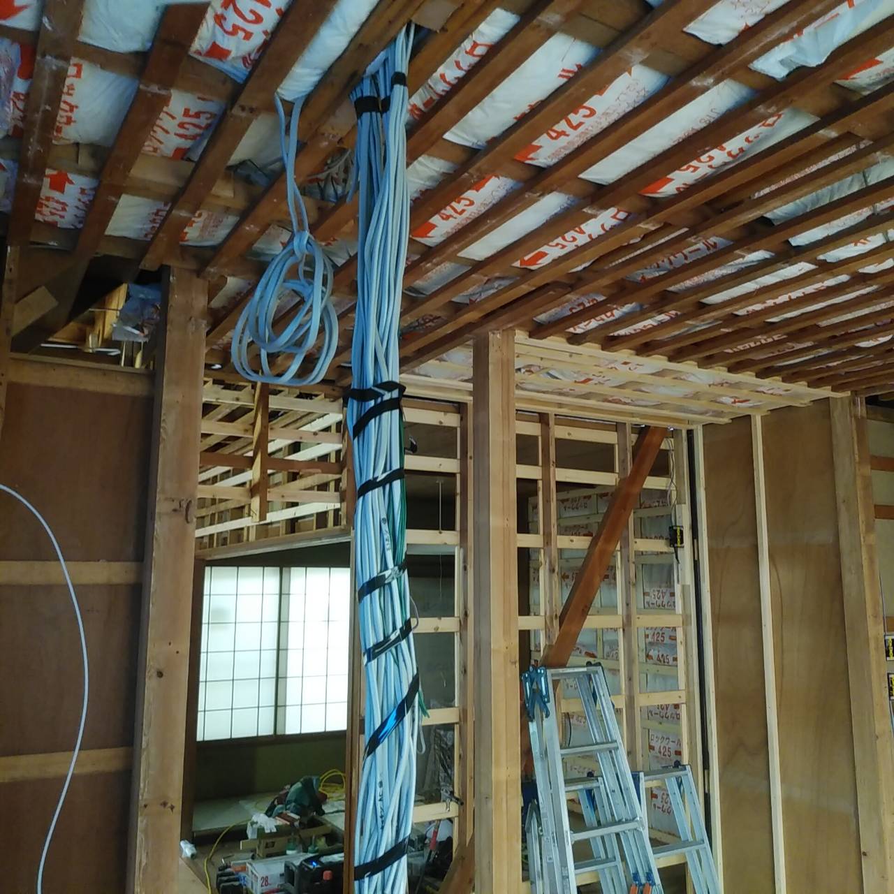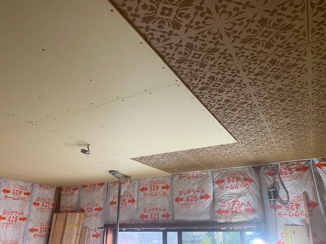 お二階の部屋の天井でもボード貼りが進められています。