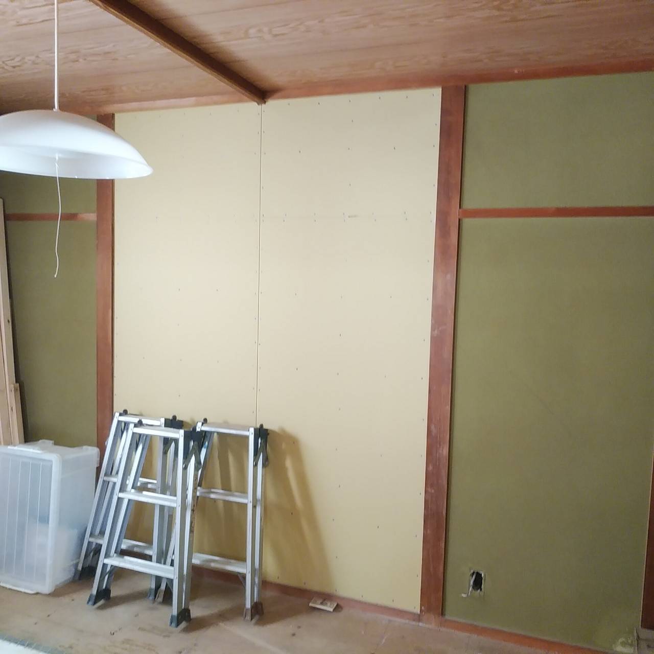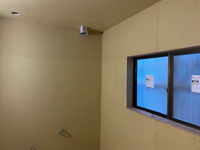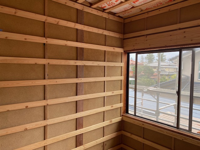 二階の和室だったお部屋を洋間に変える工事を行っております。見えていた柱に下地をつけてプラスターボードをはっていきます。