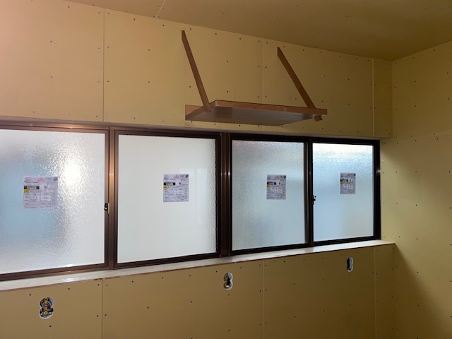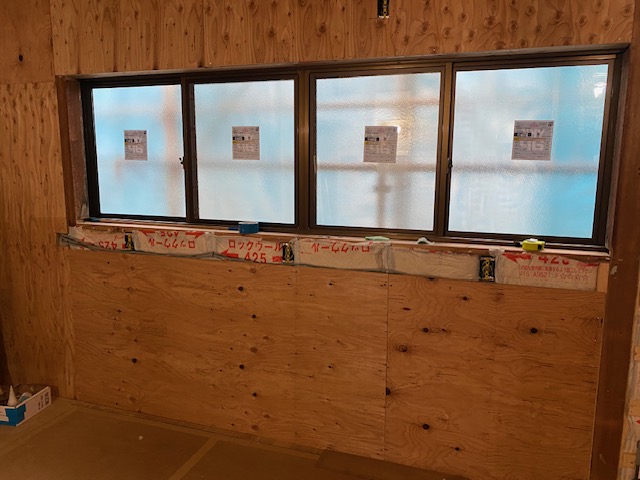 リビングの壁の下地材が施工されておりました。既存の窓枠を再利用するため、ベニア板で厚みを調整しています。