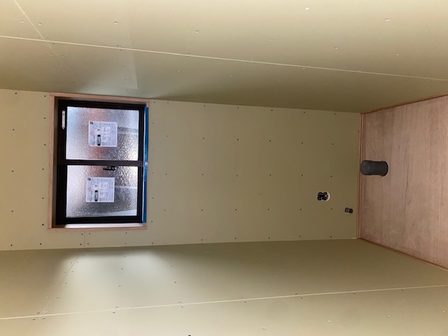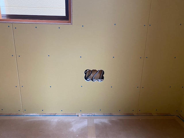 息子様のお部屋のプラスターボード貼りが完了しています。画像にある穴はコンセントをお取り付けする部分です。 たくさんの家電製品を接続するために、容量を増やしております。
