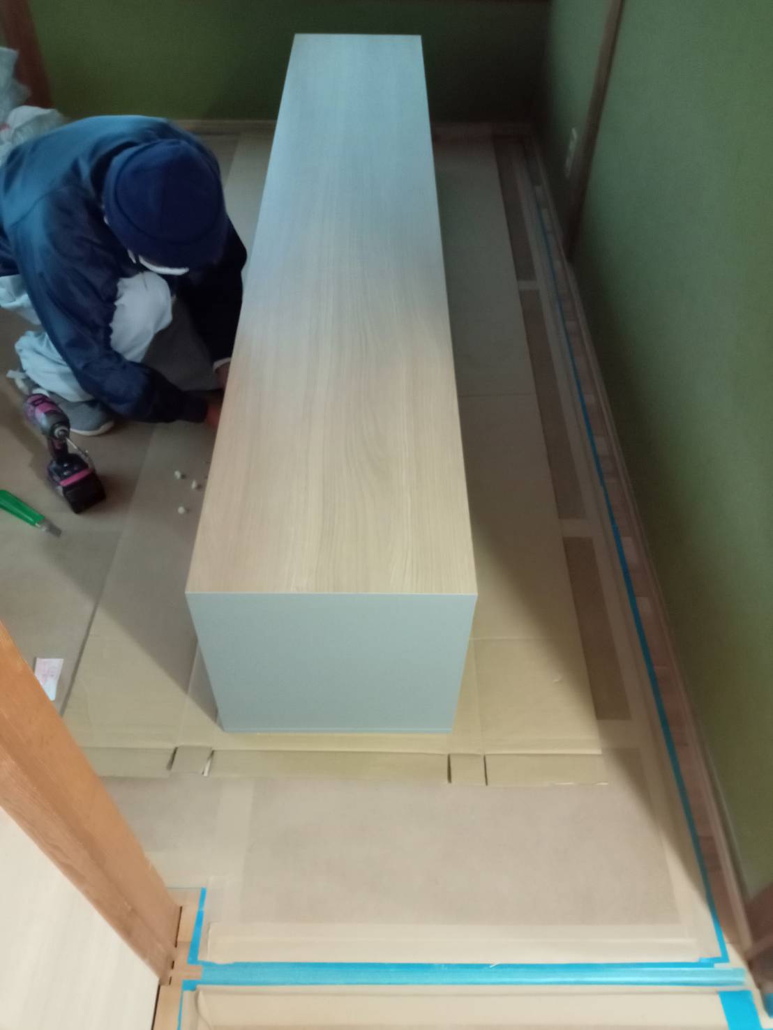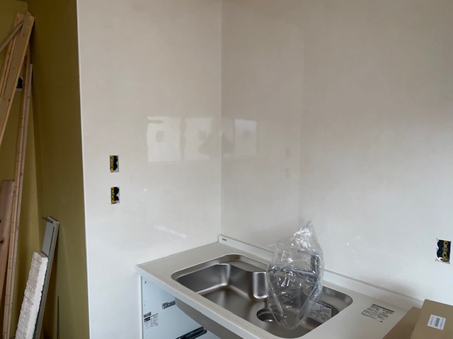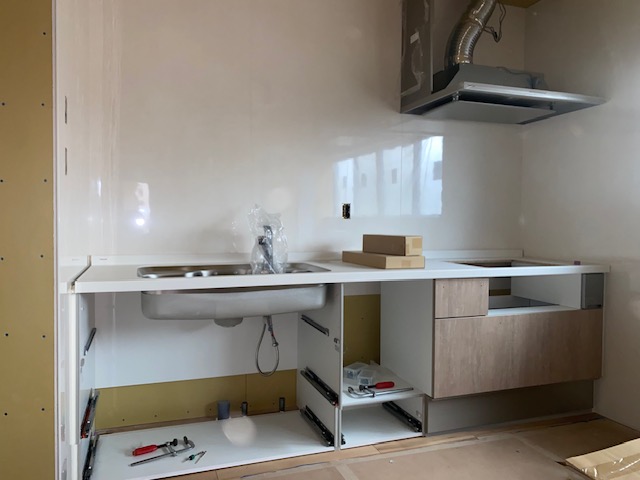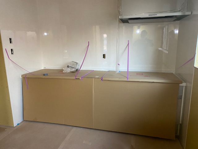 キッチンの取り付けが全て完了いたしました。 キズがつかないよう養生しておりますので、お披露目はクリーニング作業の時になります。しばらくお待ちください。