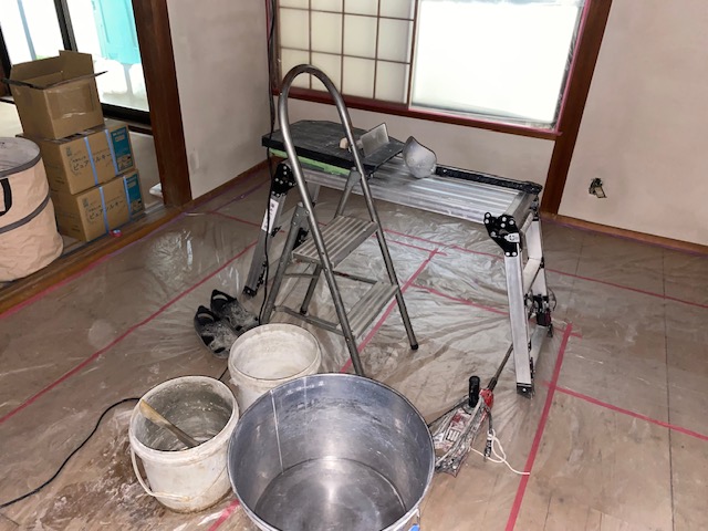 和室の左官屋さんの工事が始まっています。左官工事の後はクロス工事などの内装工事を順次行っていきます。