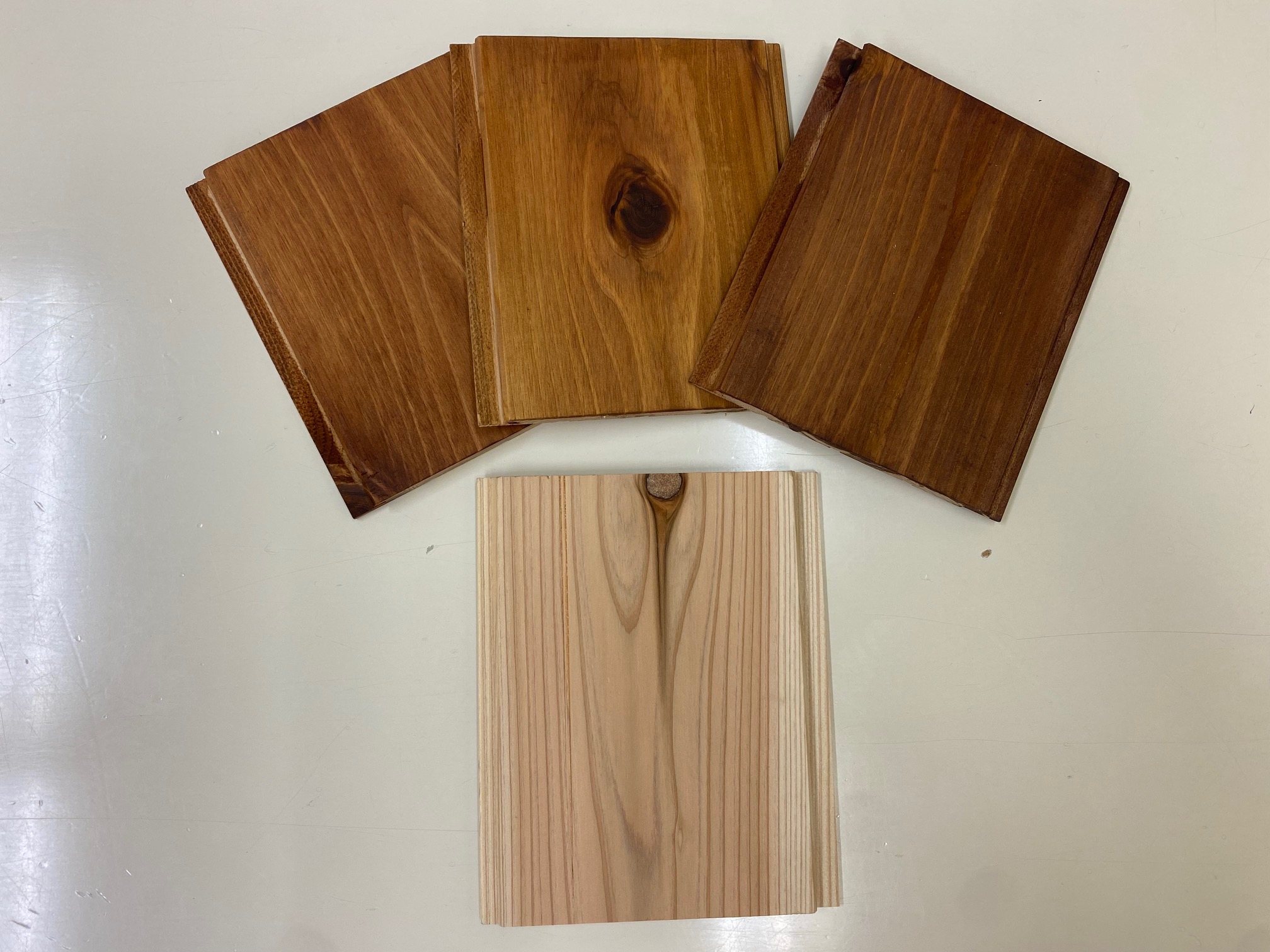 先日の色打合せで決定した和室天井の杉板を改めて紹介します。 上の3枚は着色したもので、下の1枚はKuuさんが選んだ無塗装品です。木の香りが感じられる安らぎのある空間になりそうですね。