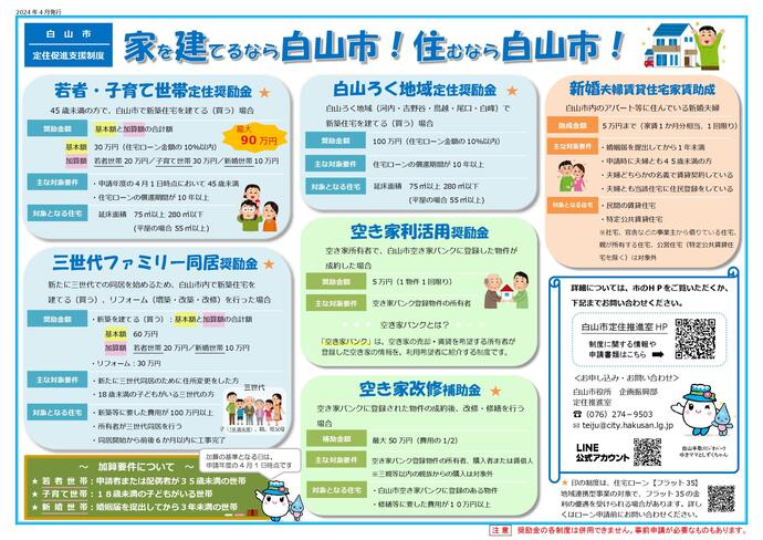 白山市で新築工事を行う場合、国の補助金とは別に、白山市独自の補助金制度(定住促進奨励金制度)がございます。Kuu様のご計画もこの制度の対象となりますので、当社にて申請手続きを進めさせていただきます。