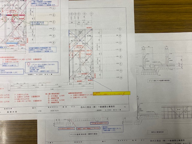 数々の図面をもとに長期優良住宅の申請が進んでおります。断熱性能のみならず耐震性能についてもしっかりとした定めがあるため、日々事務局との折衝、確認作業を進めている状況です。承認が取れ次第、年内の着工を予定しております。