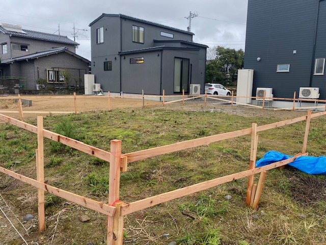 先週より工事に着手しております。画像は丁張作業というもので、基礎工事を行う際に業者様に位置や高さを示す大切な工程になります。