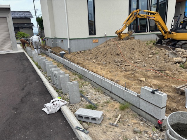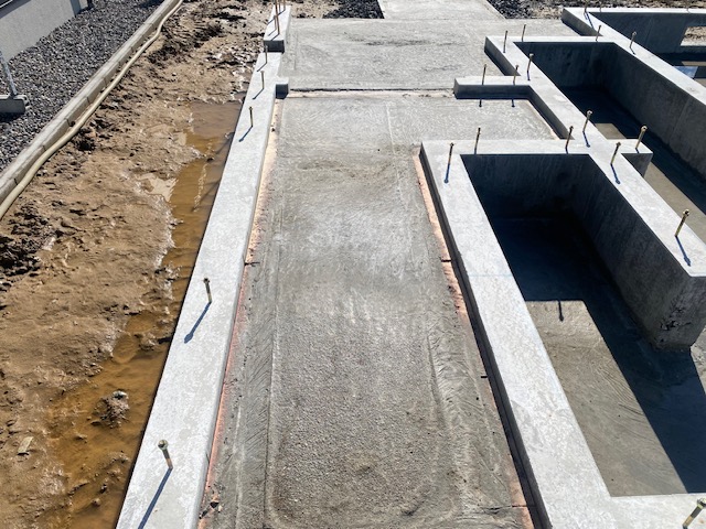 基礎立ち上がりのお化粧が完了しています。付近の土の部分も埋設の配管工事が終わり、きれいに整地されていました。
