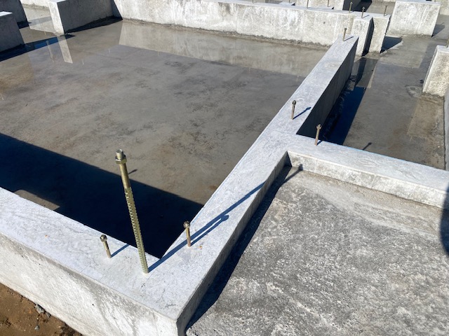 年末に型枠の解体を行い、現在養生中の状況です。 基礎立ち上がりの天端に見える短いアンカーは土台と繋げるもので、長いアンカーは土台を貫通させ柱とつなげるものです。地震による横揺れ、縦揺れからお家を守る大切な材料となります。