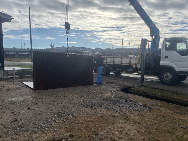 定例の安全パトロールを実施いたしました。 敷地へは大きな重機が出入りするため、側溝を傷めないよう鉄板が敷かれておりました。