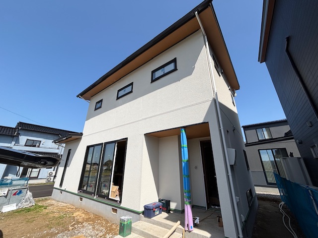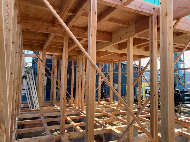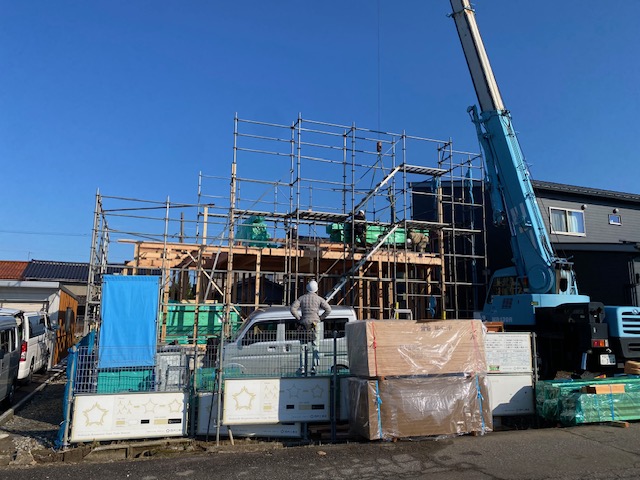 本日、無事上棟を迎えております。 昨日雨がウソのような晴天のもと、多くの職人さんにより作業が順調に進んでおります。 午後には2階の屋根組の作業に入りますので、改めて投稿させていただきます。