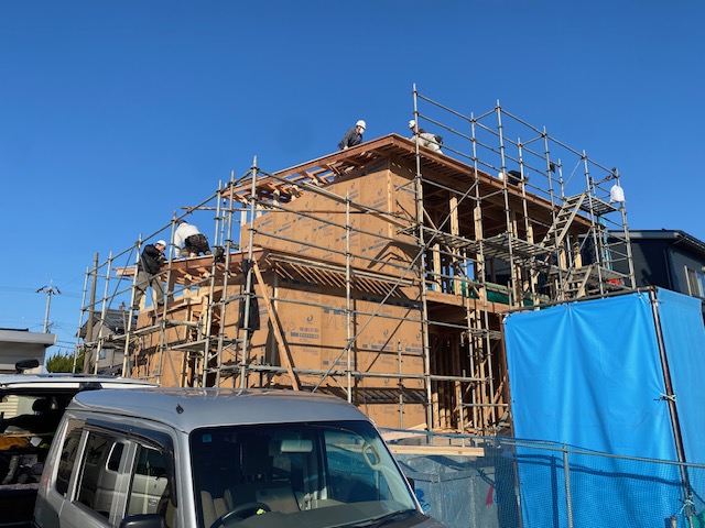 上棟も午後の作業を迎え大屋根の野地板貼りを行っております。
