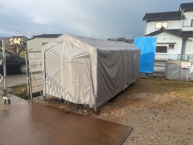 大工さんの工事が計画通りに進むように、材料保管用のテントが設置されています。