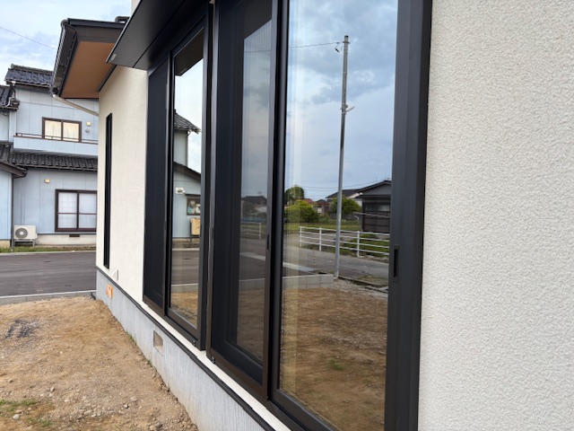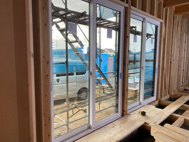 サッシが搬入され大工さんによる取付が完了しました。画像はリビング南面の掃き出し窓です。爽やかな白色の枠が清潔感を出しています。