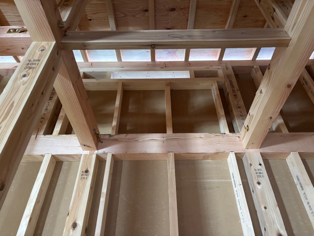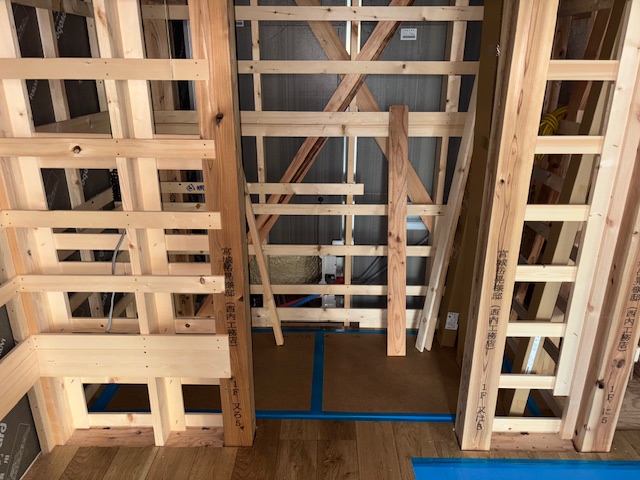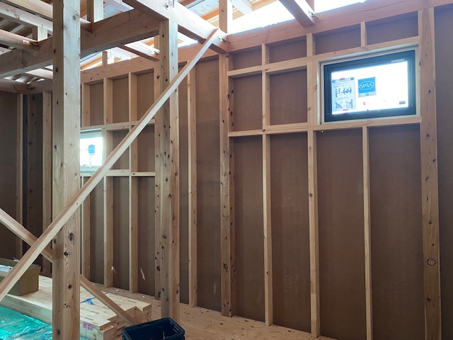 二階の外周面の間柱や窓まぐさの取り付けが完了しています。