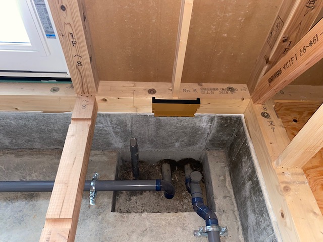 画像正面に見えるのはWBハウスの部材の一つのバリアヘルスといいます。床下の空気を壁面に垂直に流す大切な部材となり、1階部分に19個取り付けられています。また、手前には先行配管が見えます。