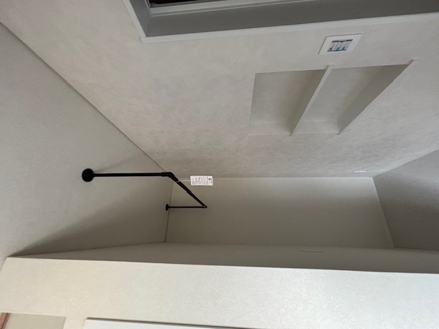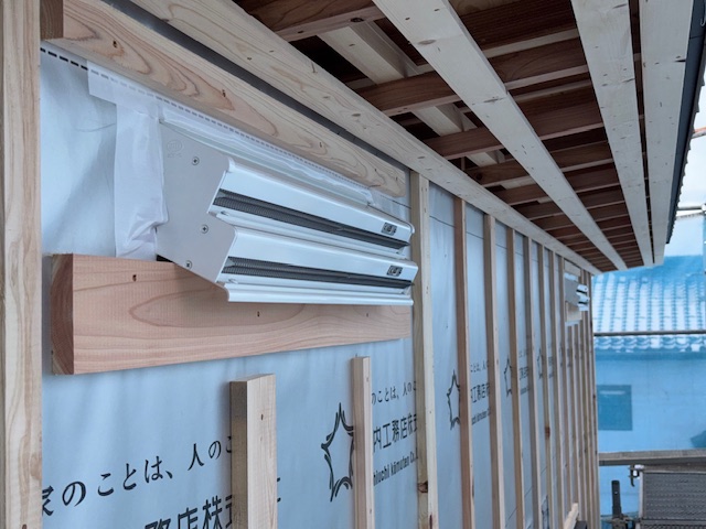 二階の天井裏になる部分にある細長い開口はサイドヘルスを取り付ける部分になります。基礎から壁内を通った空気を排出する大切な材料となります。