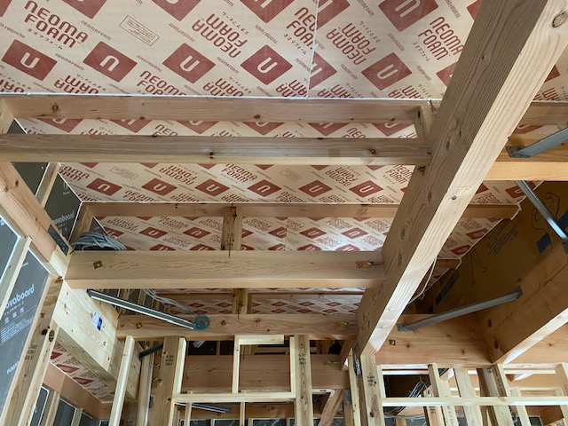 先日ご紹介した1階下屋裏の断熱材です。 外気に面する部分に断熱材が施工されております。