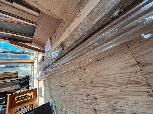 リビングサッシの上部の様子です。のちに取り付ける庇用に下地が施工されております。