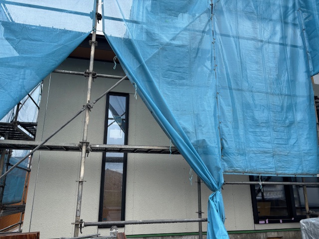 外壁の吹付工事が完了したしました。本日養生材の撤収を行います。