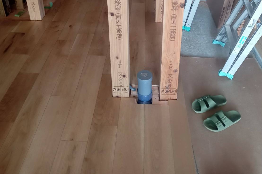 二階に床を見てみるとところどころに小さな穴があります。これは1階からの空気を2階から天井に通すためのものです。WBハウスの特徴の一つとなります。