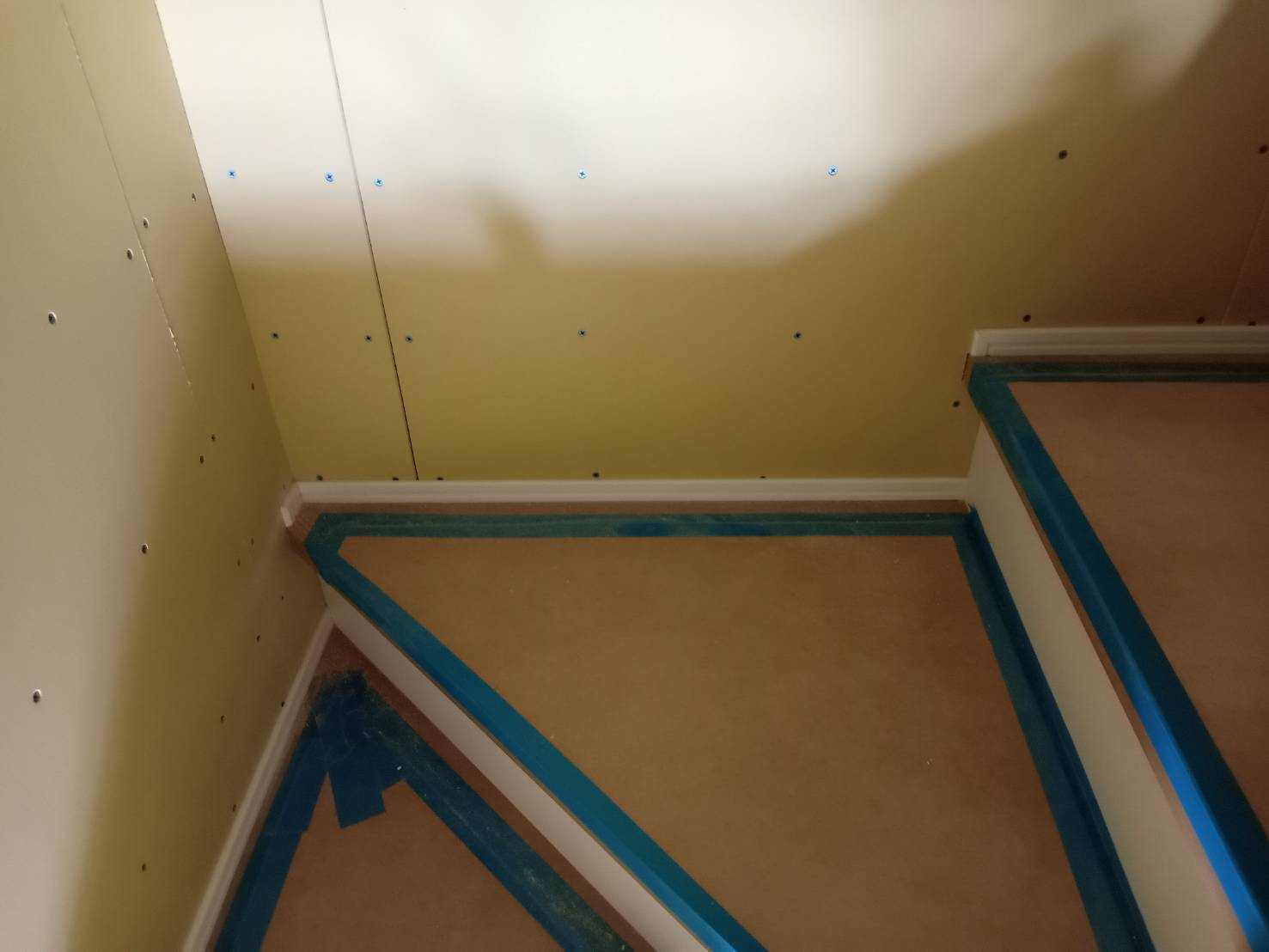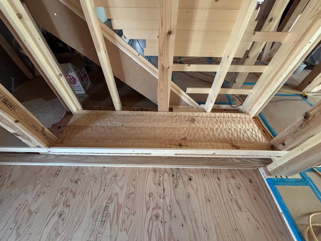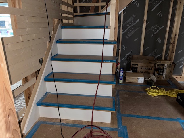 2F~階段にかけて、ボード張りが完了し、巾木の施工を進めています。 階段については、踏板の幅に合わせた寸法の巾木が丁寧に施工されています。 これから1階の内部仕上げに向けた工事を進めてまいります。 引き続きよろしくお願いいたします。