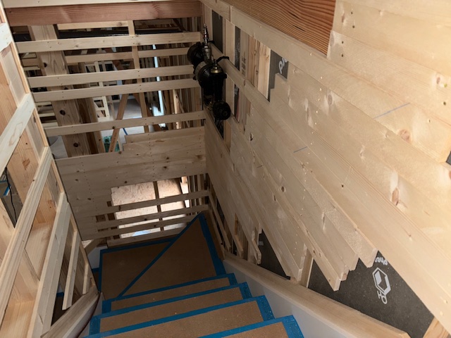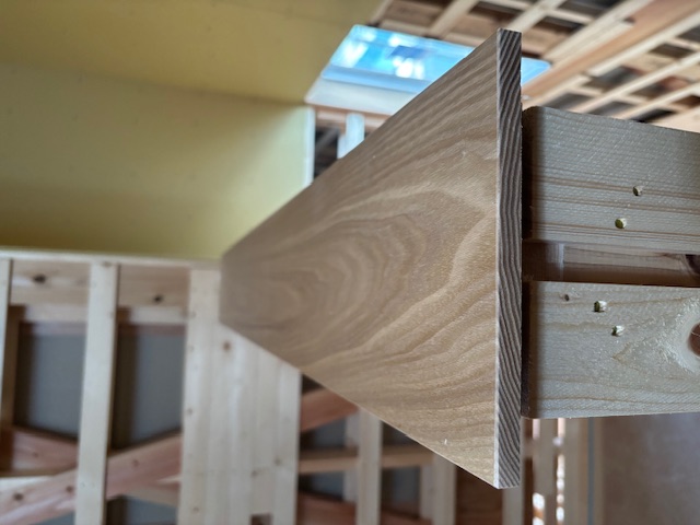 本日は中間検査にご出席いただきありがとうございました。 お気付きかと思いますが、2階階段笠木の施工も完了しておりました。 他の、造作材と併せて大工さんの工事完了後に塗装を行います。