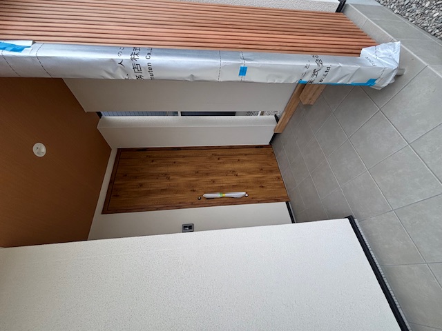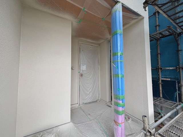 本日は安全パトロールを実施しました。玄関前に取り付けた柱が材料搬入時に傷つかないよう、しっかりと養生されておりました。