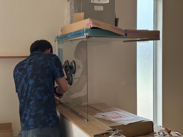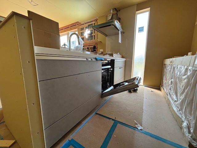 現在キッチンの取り付け工事を行っております。職人さんが図面を見ながら、大きな部品、小さな部品を正確に取り付けなされておりました。