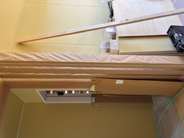 本日安全パトロールを実施いたしました。 作業場所に限らず、作業を行っていないところも整理整頓がされていました。 画像は建具枠と戸袋となる部分のボードの様子です。